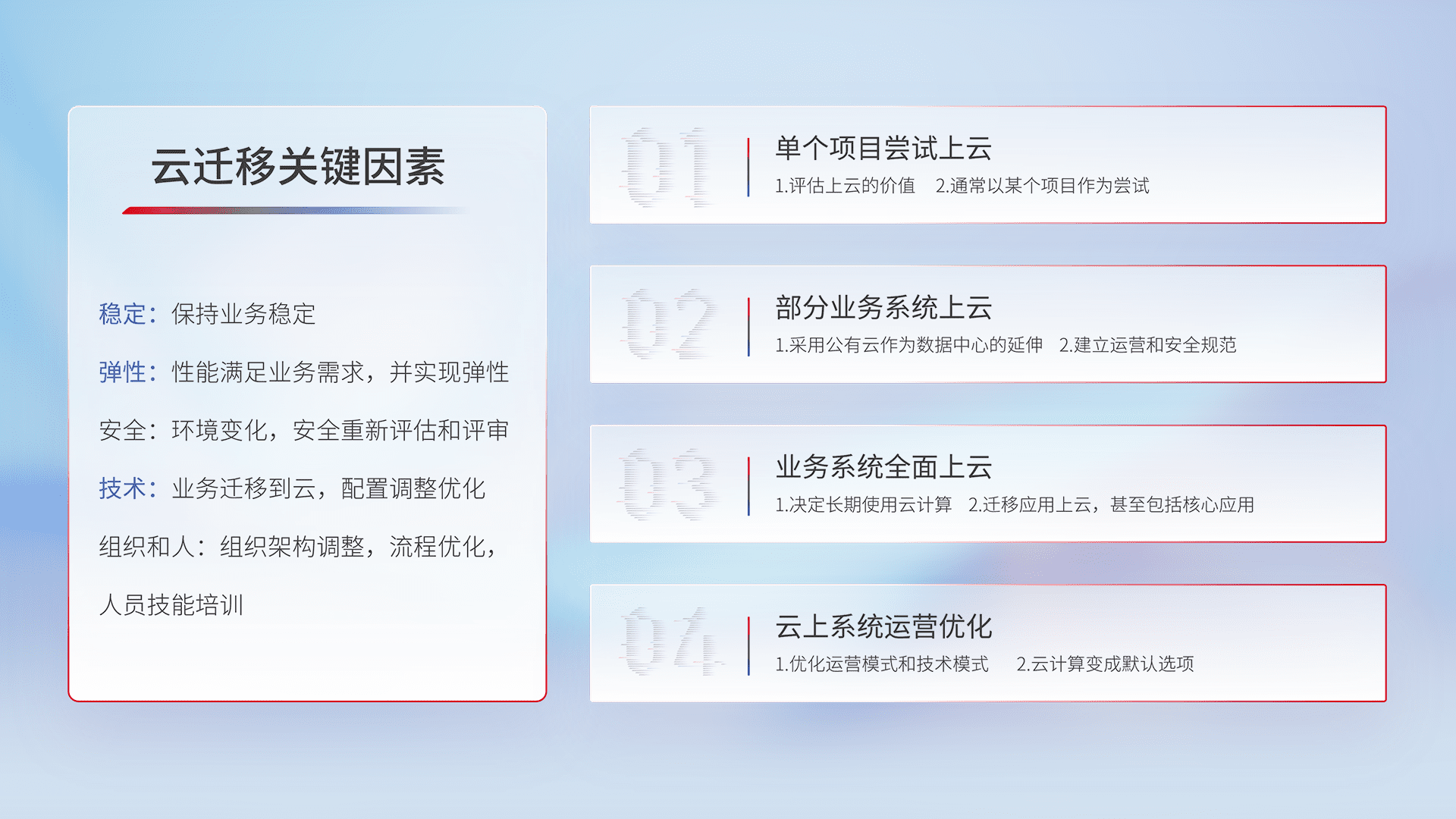 结合实际业务,,,,从规划设计、、、、云平台选型、、云原生改造、、、、数据迁移、、、、集成交付,,,,迁移全过程为客户识别最佳上云路径,,做好风险识别管理,,设计网络架构、、、、身份权限、、、安全审计合规、、操作审计、、日志审计、、监控告警策略、、、、多站点容灾设计等,,,,对云上基础设施进行整体规划,,提升IT治理水平,,,以满足弹性、、高可用、、高性能的需求。。